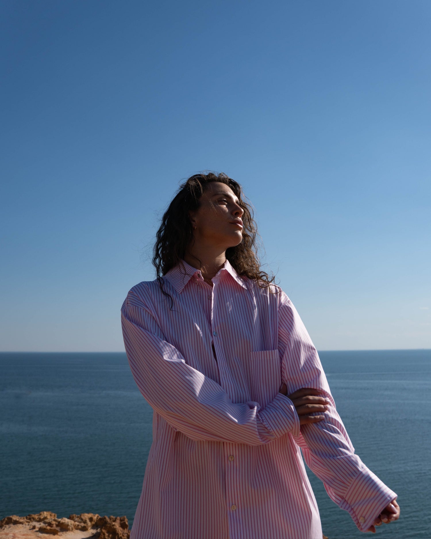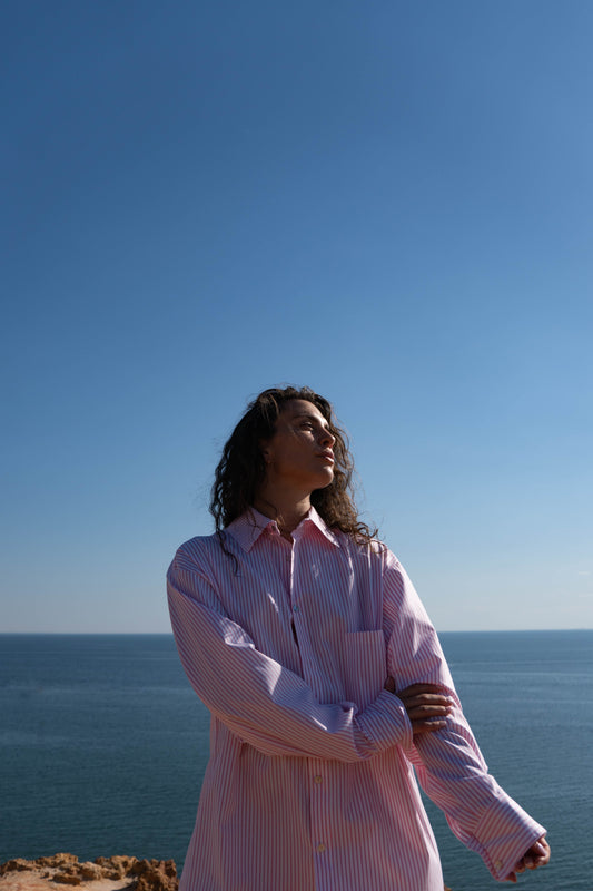 This is our customizable Oversize Unisex Shirt, with signature pearl buttons.